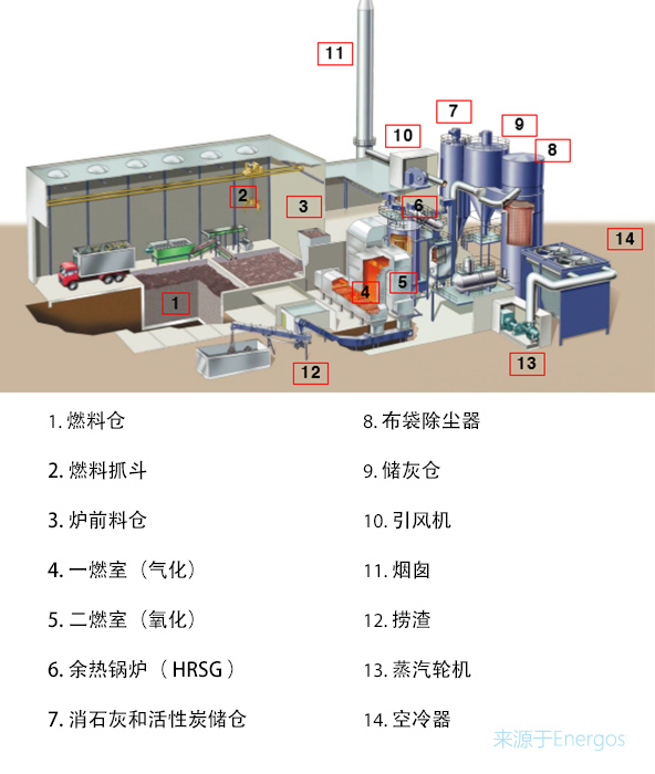 该方案主要包括:给料系统,城市生活垃圾气化系统,合成气氧化系统,余热锅炉系统,烟气处理系统,蒸汽发电系统。